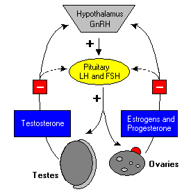 FSH and LH are produced by the pituitary gland in the brain and control the function of the ovaries in women and the testes in men. Together they are part of the hypothalamic–pituitary–gonadal (HPG) axis, the hormonal system that regulates reproductive hormones.